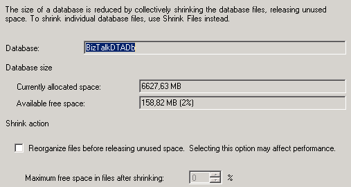 Unexpectedly, it can sometimes occur that you notice that your BizTalk DTA database has grown from a small tracking database to a huge database taking up all disk space on your server. I had the same issue at a client, and have noticed that this can have quite some consequences: BizTalk server stopped processing messages, no backups could be taken anymore from the databases, etc. Not really something you want to happen to a critical environment.