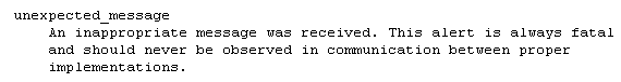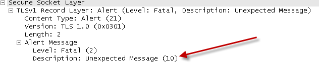 TheRFC (http://www.ietf.org/rfc/rfc2246.txt)does not really shed any more light on the “unexpected message” error.