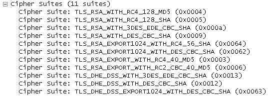 Comparing the request to the successful OpenSSL TLSv1 handshake, we notice that OpenSSL sends along 27 suggested cipher suites (a selection of them in the screenshot):